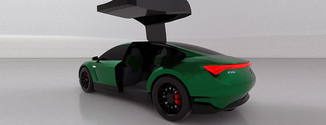 The exterior panels are made of carbon fiber, and the structure is constructed from aerospace aluminum to provide lightweight yet strong protection for its occupants. The electrical drivetrain is positioned at the bottom of the vehicle, allowing for storage in both the front hood and the rear. The drivetrain features a unique design that eliminates the need for occupants to step out of the vehicle to charge. All exterior features are designed for ease of use. The rear vehicle lightstrip uniquely identifies the ROAR brand and complements the headlights. Despite being electric, the vehicle is tuned to roar like a lion.